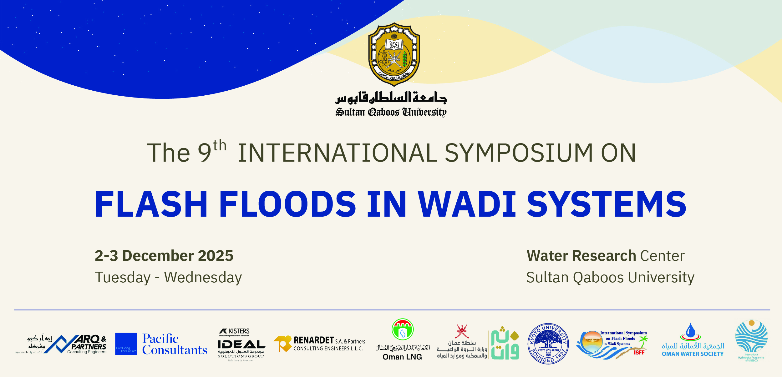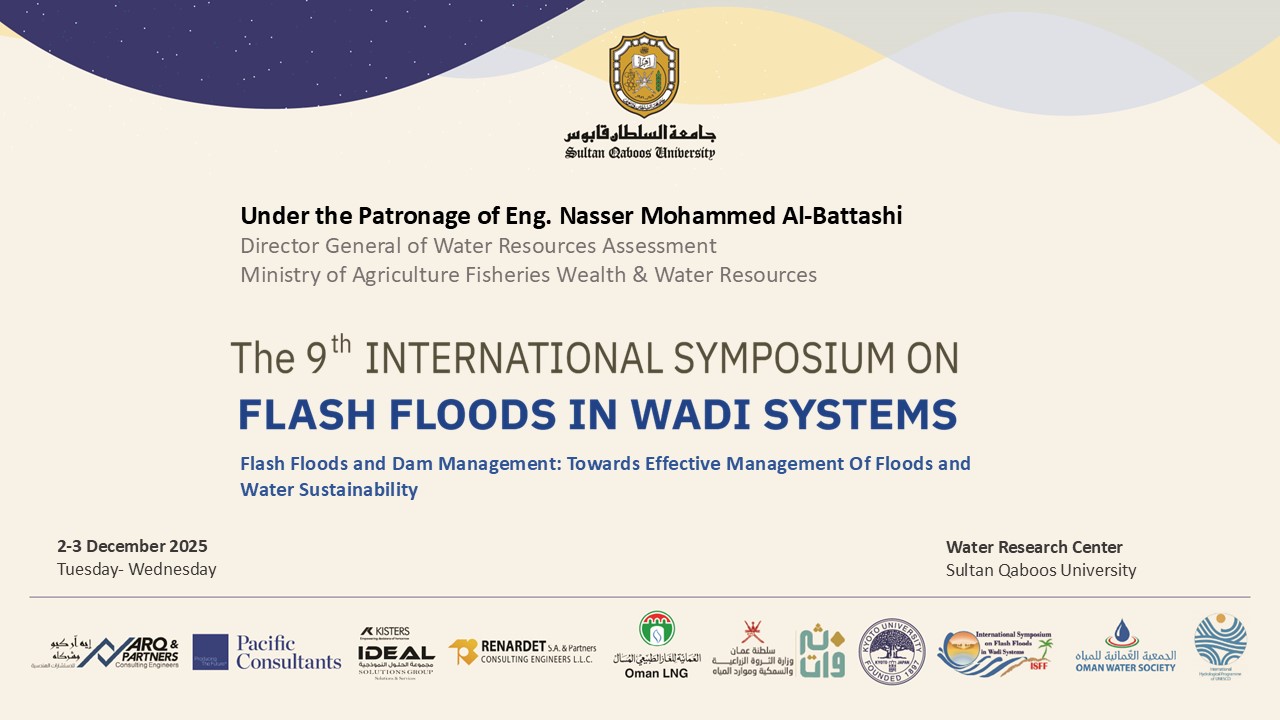 The 9th International Symposium on Flash Floods in Wadi Systems (ISFF9) is organized by the Water Research Center, Sultan Qaboos University (SQU) on December 2-3, 2025. The two-day symposium will take place in Muscat, Oman, at the campus of the SQU. This version will convene on the theme "Flash Floods and Dam Management: Towards Effective Management of Floods and Water Sustainability". Continuing to share knowledge, experiences and lessons learned by all participants, ISFF9 organizers welcome presentations from all relevant fields.